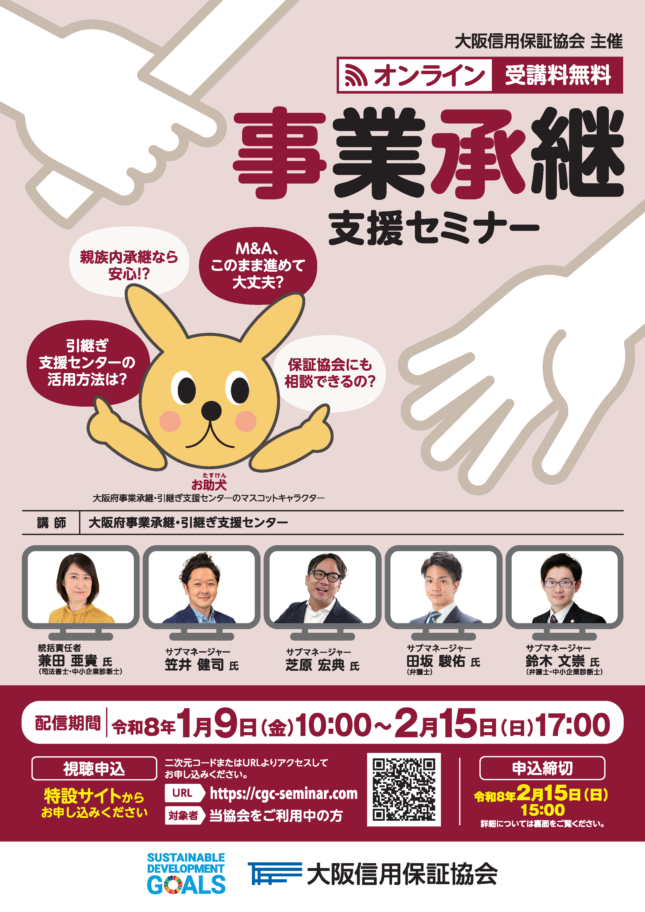 本セミナーでは、協会Webサイトで通年公開している事業承継動画の内容を基礎として、親族内承継およびM&Aのリアルな事例を交えながら、具体的な進め方や留意点をさらに深掘りしてお伝えします。